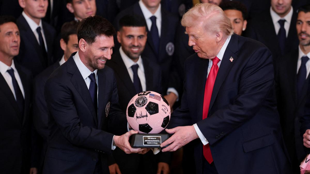 Lionel Messi daroval prezidentovi Donaldovi Trumpovi ozdobenú ružovú futbalovú loptu, ktorá svedčí o farbe Interu Miami – počas ceremoniálu v Bielom dome na počesť klubu za víťazstvo v minuloročnom pohári Major League Soccer (MLS).