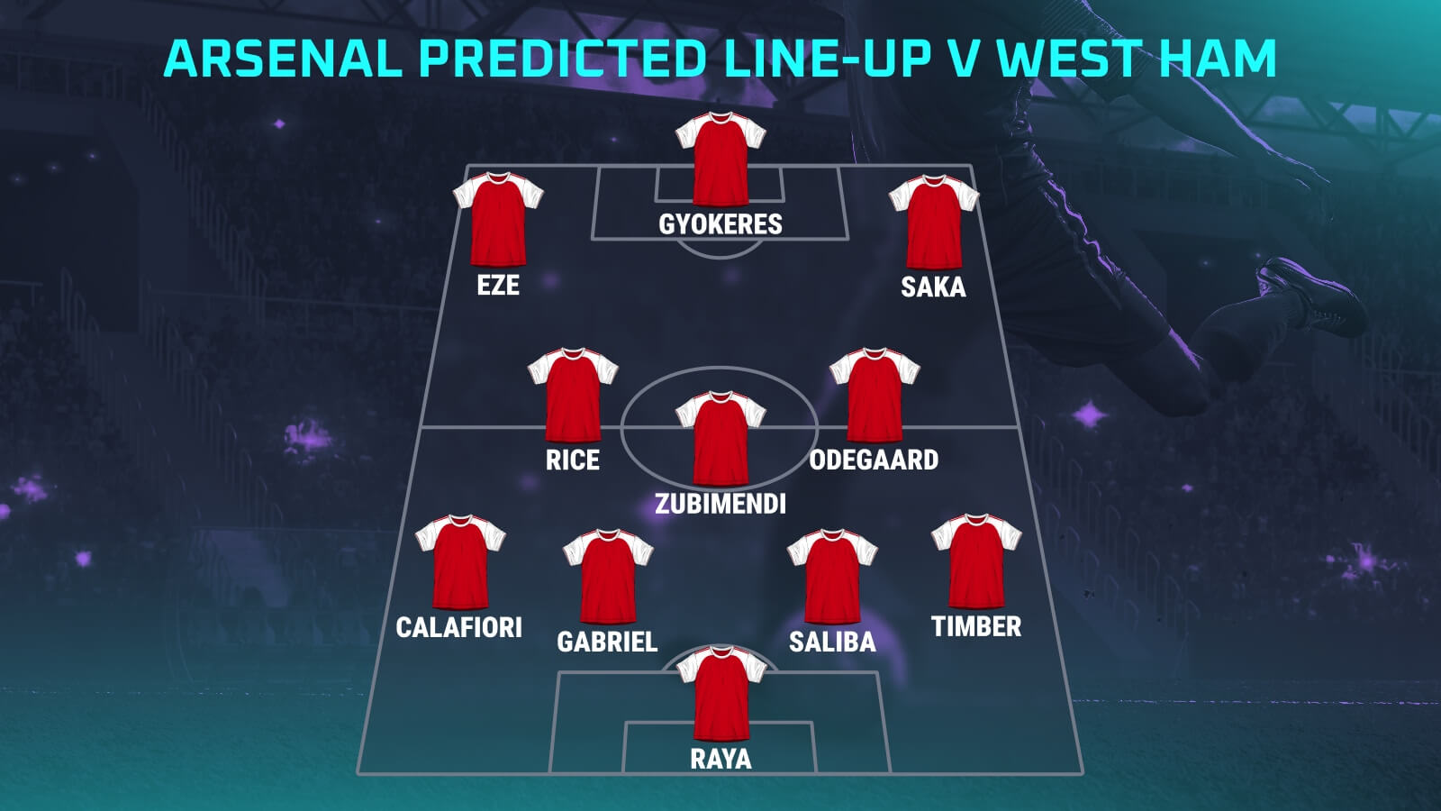(4-3-3) Raya; Lumber, Salib, Gabriel, Cafarori; Ryža, Zubend, Odegarard; Saka, Gyokeres, Martinelli