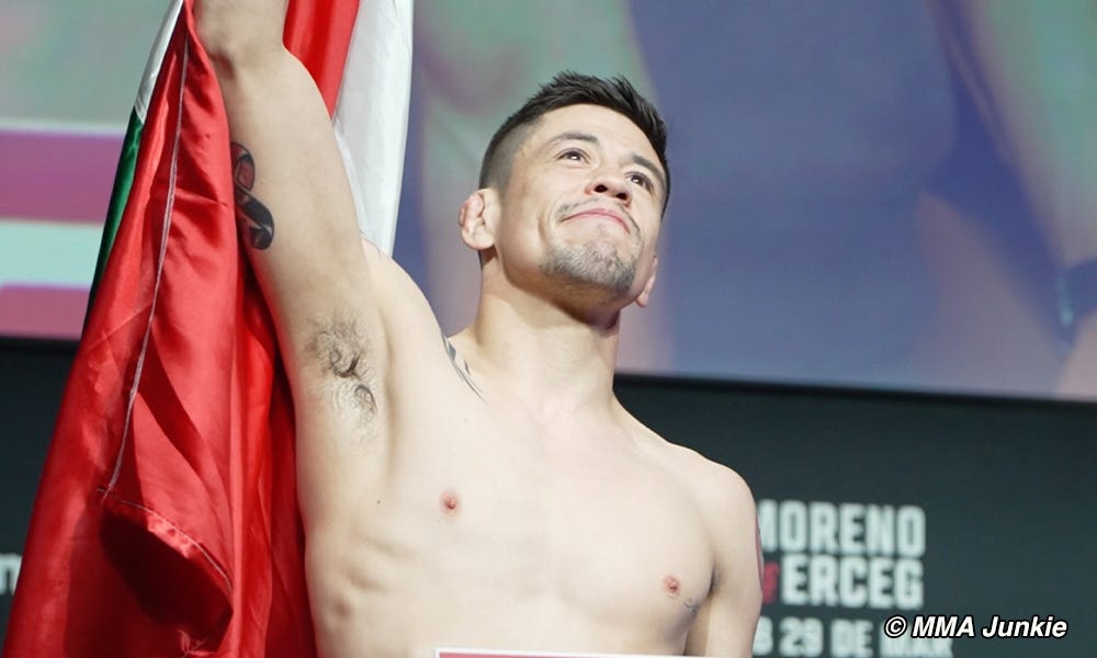 Moreno (23-8-2 MMA, 11-4-2 UFC), bývalý šampión mušej váhy, sa túto sobotu postaví proti najlepšiemu uchádzačovi Tatsuro Taira (17-1 MMA, 7-1 UFC) na turnaji UFC 323 (pay-per-view, ESPN2/FX/Disney+, ESPN+), ktorý sa koná v T-Mobile Arena v Las Vegas. Ak by mexická hviezda zdvihla ruku, ťahal by sériu troch víťazných zápasov a 3:1 od straty opasku s Alexandrom Pantojom, ktorý obhajuje remeň v hlavnom zápase UFC 323 proti Joshuovi Vanovi.