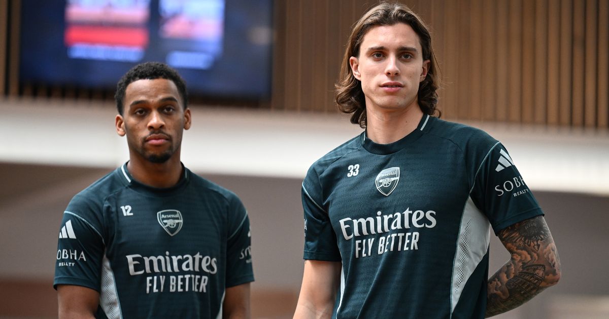 Jurrien Timber a Riccardo Calafiori počas tréningu Arsenalu