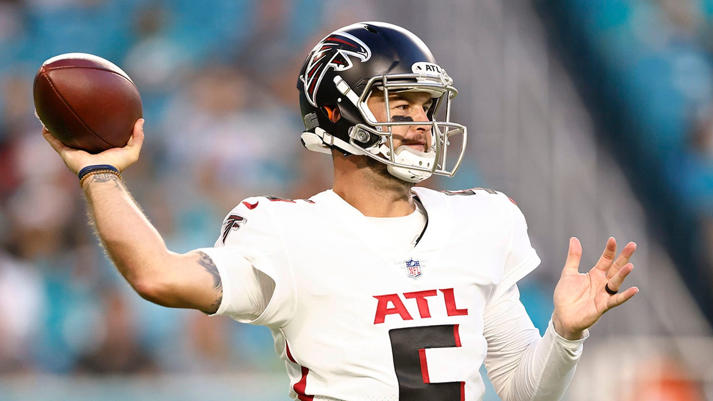 AJ McCarron (5) z Atlanta Falcons sa snaží prihrať proti Miami Dolphins počas prípravného zápasu na Hard Rock Stadium 21. augusta 2021 v Miami Gardens na Floride. (Michael Reaves/Getty Images)