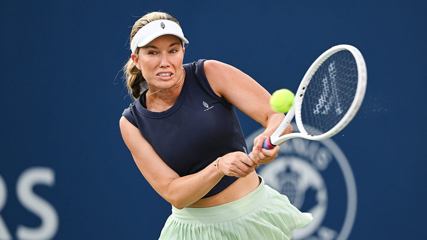 Danielle Collins (USA) vracia loptu Viktoriyi Tomovej (BUL) v prvom kole hry na IGA Stadium 27. júla 2025. (David Kirouac/Imagn Images)