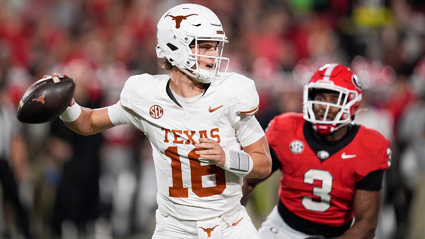 Rozohrávač Texas Longhorns Arch Manning (16) sa 15. novembra 2025 snaží presadiť v prvom polčase proti Georgia Bulldogs na Sanford Stadium. (Dale Zanine/Imagn Images)