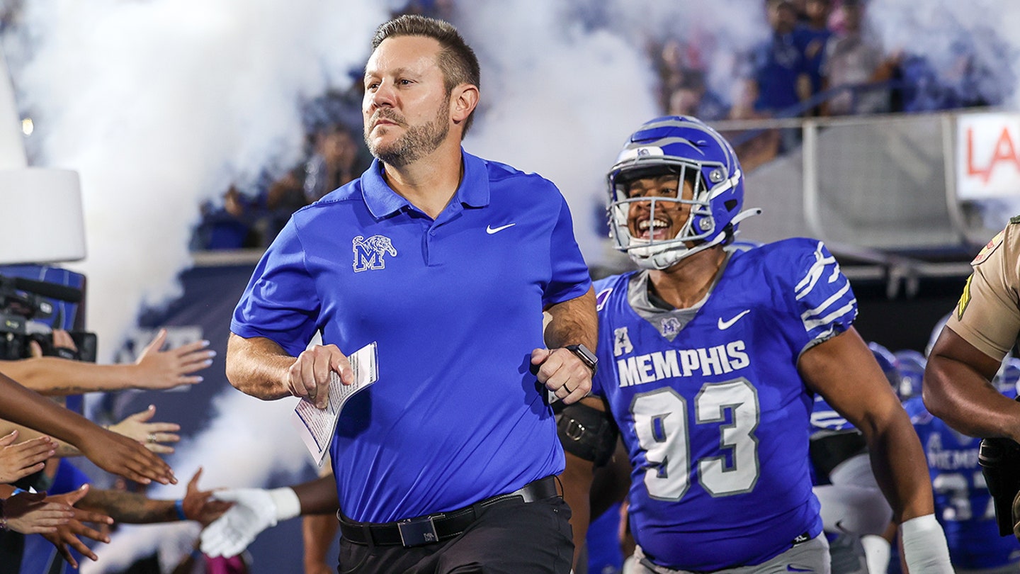 Hlavný tréner Memphis Tigers Ryan Silverfield a obranca Jalen Bell (93) vybehli na ihrisko pred zápasom proti Tulsa Golden Hurricane na Simmons Bank Liberty Stadium 4. októbra 2025. (Wesley Hale/Imagn Images)
