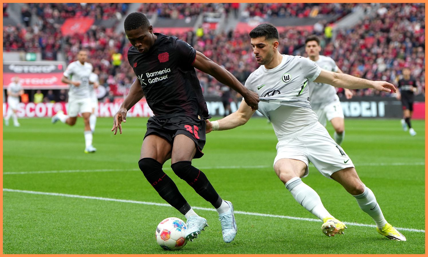Christian Kofane v akcii za Leverkusen proti Wolfsburgu (Foto: Pau Barrena/Getty Images)