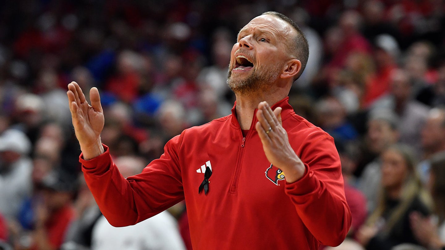 Hlavný tréner Louisville Pat Kelsey nemal rád telefonát počas druhého polčasu, keď Louisville Cardinals hostili Kentucky Wildcats na KFC Yum! Centrum v utorok 11. novembra 2025. (Jeff Faughender/Courier Journal / USA TODAY NETWORK cez Imagn Images)