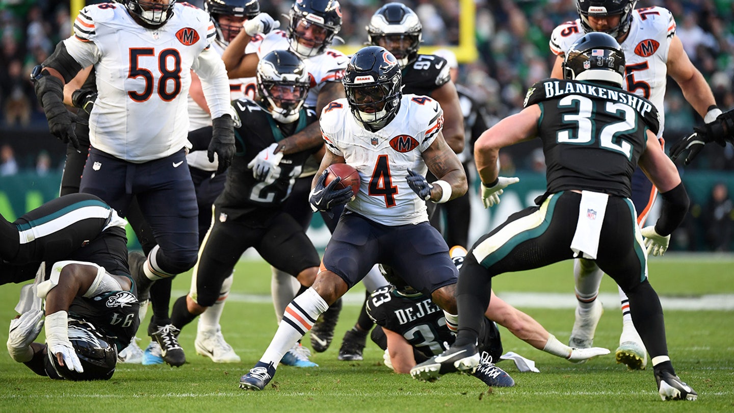 Chicago Bears running back D’Andre Swift nesie loptu proti Philadelphia Eagles počas druhej štvrtiny zápasu na Lincoln Financial Field. (Eric Hartline/Imagn Images)
