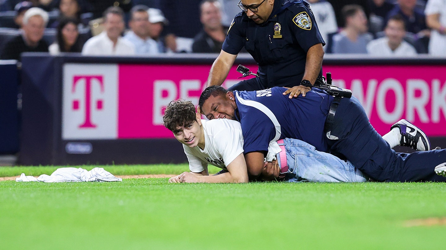 Bezpečnostní pracovníci prijímajú nasledovník, ktorý narazil do oblasti počas 4. smeny videohier 3 zbierky amerického organizačného oddelenia baseballu medzi New York City Yankees a Toronto Blue Jays, utorok 7. októbra 2025 v New Yorku. (AP Photo/Yuki Iwamura)