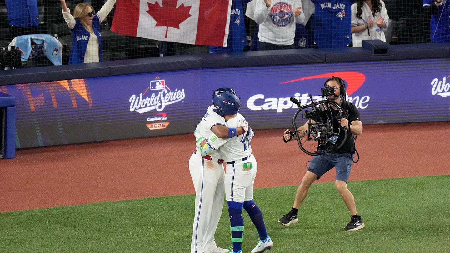 Bo Bichette z Toronta Blue Jays (vpravo) oslavuje svoj trojnásobný homerun s Vladimirom Guerrerom Jr. (27) proti Los Angeles Dodgers počas tretej zmeny v zápase 7 bejzbalovej Svetovej série v Toronte v sobotu 1. novembra 2025. (Chris Young/The Canadian Press prostredníctvom AP)