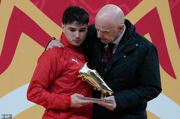 Stále viditeľne emotívny Diaz bol nútený prijať turnajovú Zlatú kopačku od prezidenta FIFA Gianniho Infantina po tom, čo skončil ako najlepší strelec.