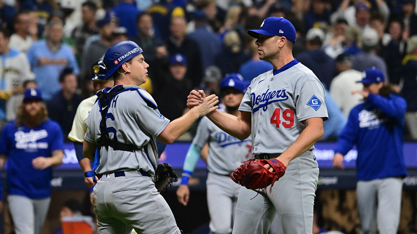 Los Angeles Dodgers Catcher určite Smith (16) a na zmiernenie fľaše Blake Treinen (49) reagujú po porazení tvorcov Milwaukee v celej videohre 1 zbierky národnej organizácie majstrov v American Household Area. (Benny Sieu/Imagn Pictures)