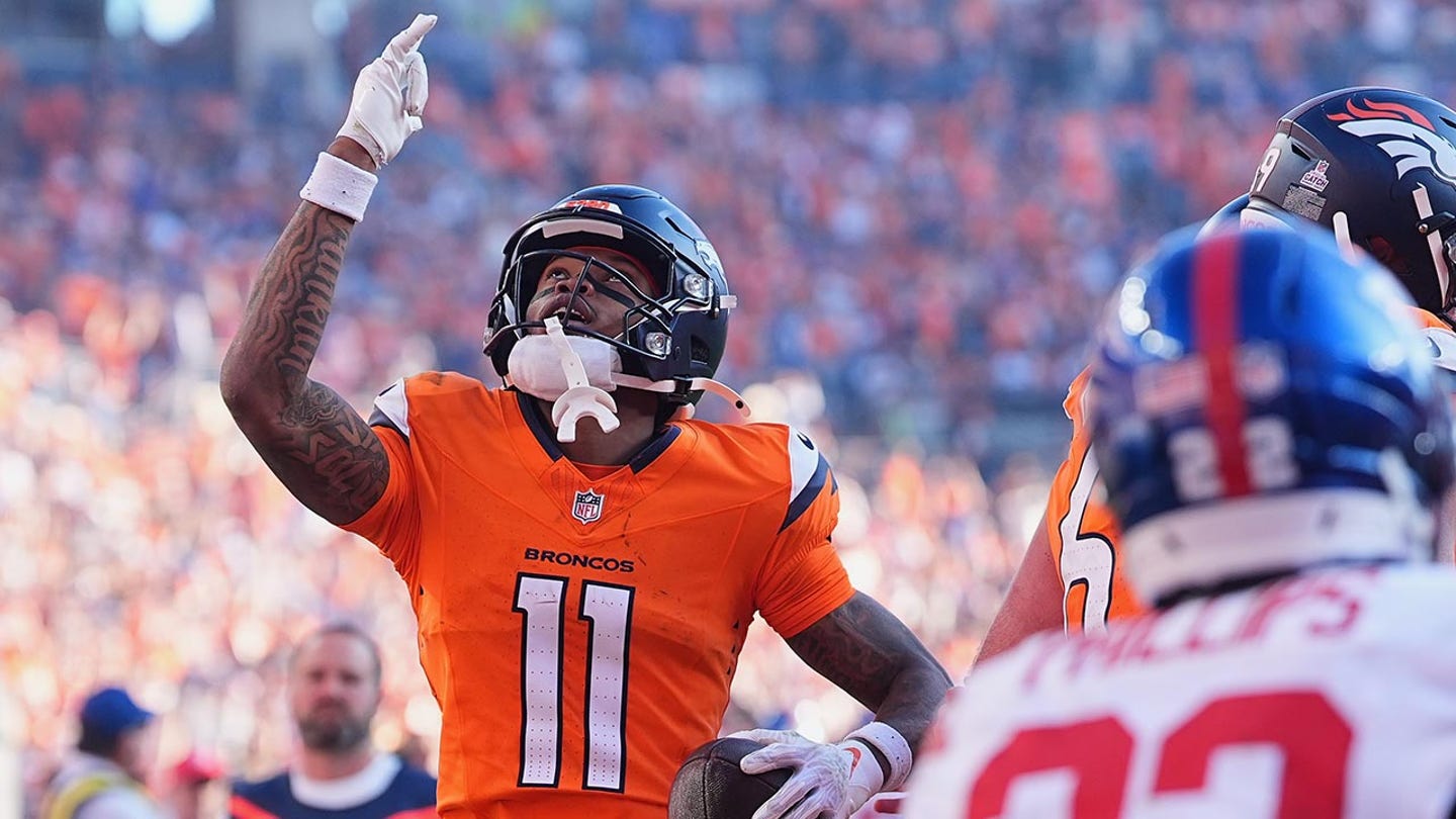Troy Franklin (11) si pripomína, že v nedeľu 19. októbra 2025 sa v Denveri 19. októbra 2025 postavil proti New york city Giants počas 2. ročníka futbalovej videohry NFL. (AP Photo/David Zalubowski)