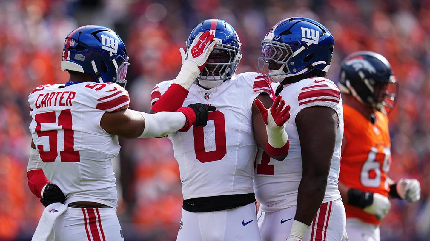 Linebacker New york city Giants Brian Burns (0) je chválený kolegami po tom, čo vyhodil quarterbacka Denver Broncos Bo Nixa počas úvodných päťdesiatich percent futbalovej videohry NFL v Denveri v nedeľu 19. októbra 2025. (AP Photo/Jack Dempsey)