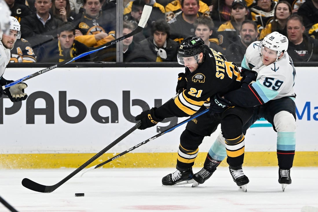 15. januára 2026; Boston, Massachusetts, USA; Center Bostonu Bruins Alex Steeves (21) prihráva puk bránený centrom Seattlu Krakenom Benom Meyersom (59) počas prvej tretiny v TD Garden. Povinný kredit: Eric Canha-Imagn Images