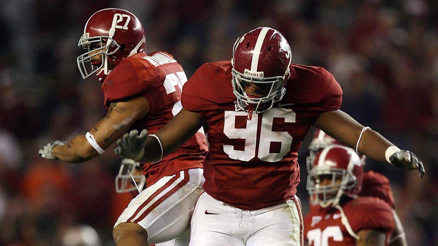 Alabamský defenzívny hráč Luther Davis oslavuje po tom, čo Crimson Tide porazili Florida Gators 32:13 v zápase majstrovstiev SEC 2009 v Georgia Dome v Atlante 5. decembra 2009. (Dale Zanine/USA TODAY Sports)