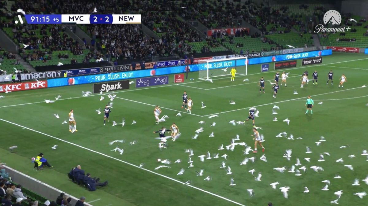 Zápas A-League medzi Melbourne Victory a Newcastle Jets v AAMI Park v Melbourne sa zmenil na chaos po tom, čo bol zápas nakrátko prerušený, keď sa na ihrisko zišiel kŕdeľ čajok.