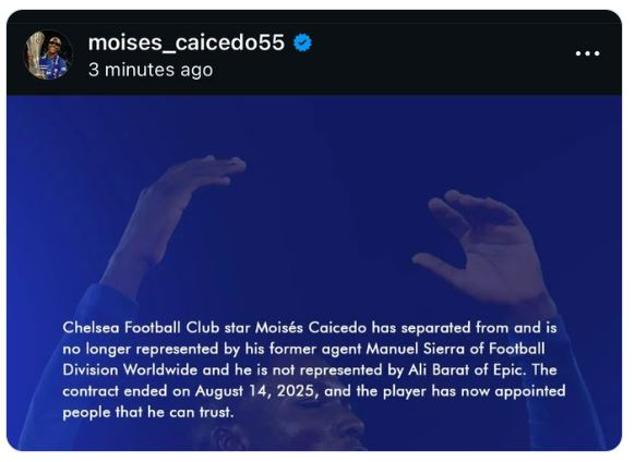 Správa, ktorú hlásil futbal.London, sa odhlásila: „Futbalová klub Chelsea Celebrity Moises Caedo sa v skutočnosti rozdelil a už viac stál jeho predchádzajúci zástupca Manuela Sierra futbalového oddelenia na celom svete a Ali Barat z neho nestál Ali Barat.