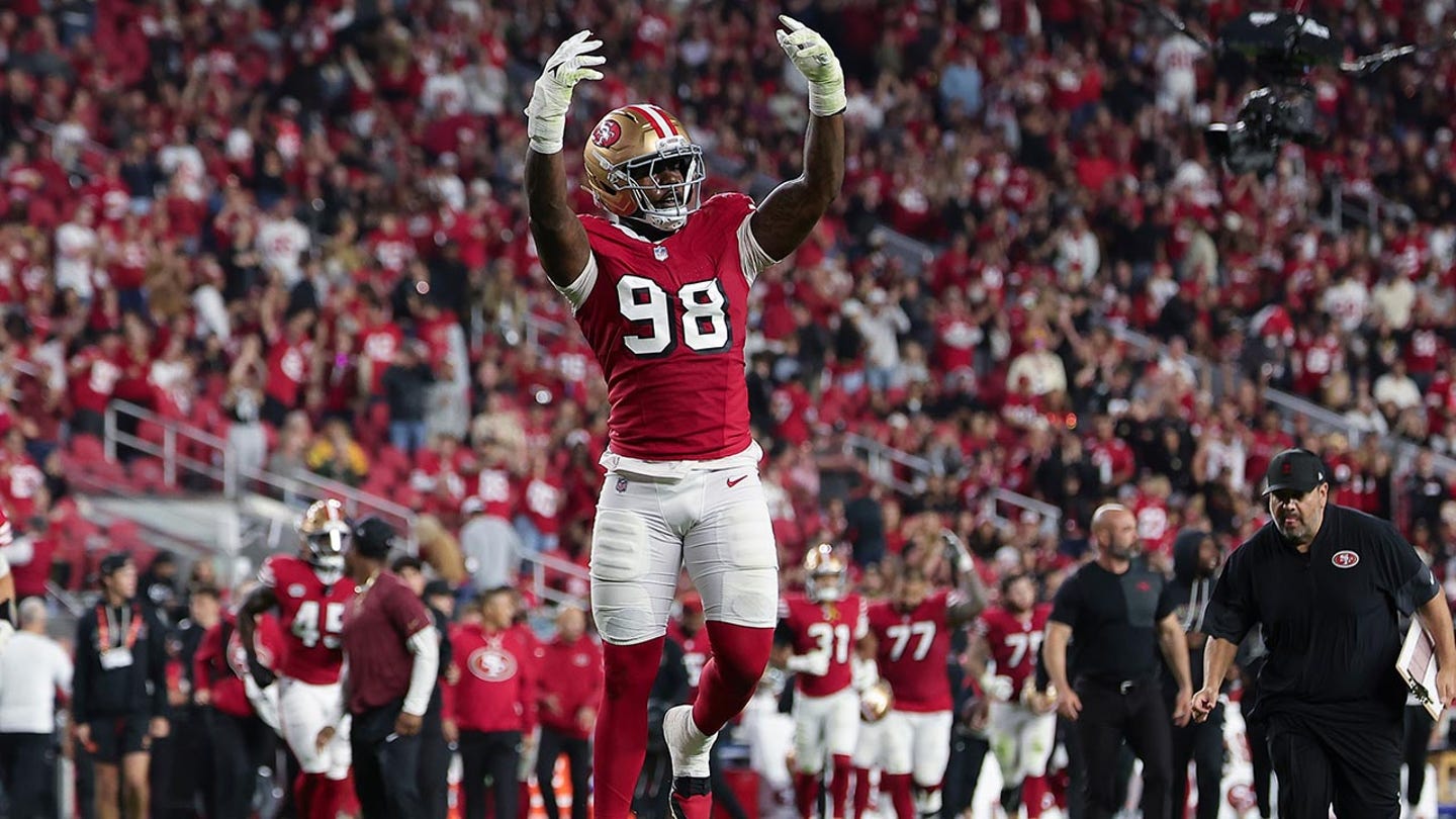 Ochranný koniec San Francisco 49ers Mykel Williams (98) si pripomína v úplne prvých päťdesiatich percentách futbalovej videohry NFL proti Atlanta Falcons, v nedeľu 19. októbra 2025 v Santa Clara, The Golden State. (AP Photo/Kelley L Cox)