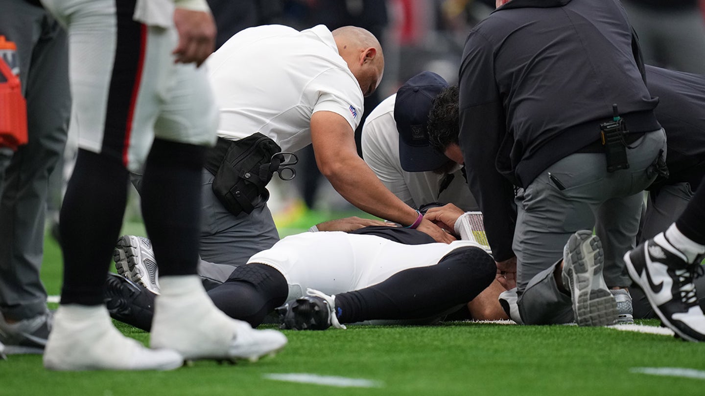 Zdravotnícky personál z Houstonu Texans kontroluje CJ Strouda z Houstonu Texans ležiaceho na zemi po tom, čo Strouda trafil pri behu lopty v prvom polčase futbalového zápasu NFL proti Denver Broncos v nedeľu 2. novembra 2025 v Houstone. (AP Photo/Eric Gay)