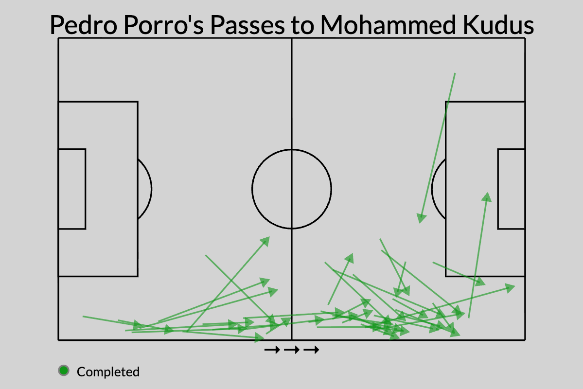 Winger Ghana v skutočnosti dostal 171 prišiel v období 6 videohier; Iba normálny chrbát 4, plus brankár Vikár Guglielmovlastne sa dostali oveľa viac. Pravý chrbát Pedro Porro Páči sa mi prechádza na kudus a účinne spája 39 -krát. Dvanásť z nich bolo v skutočnosti modernými prihrávkami, ktoré sú v skupine najväčšie zhody.