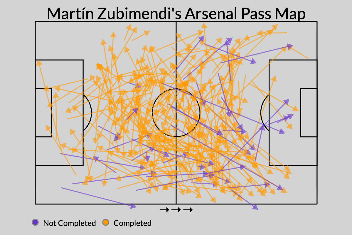 26-ročný skutočne vyslal o niečo väčšiu škálu prihrávok (57) na zmes Saliba a Cristhian Mosqueraktoré skutočne zdieľajú povinnosti na ideálnej strane hlavnej ochrany, ako na Gabriel ľavicové krídlo (48). Lepšie upredu Deklanová ryža (45) Ľavé krídlo ako akýkoľvek typ zmesi Ødegaard, Mikel Merino a Eberechi Eze, ktoré všetky zdieľali 3. stredný port.