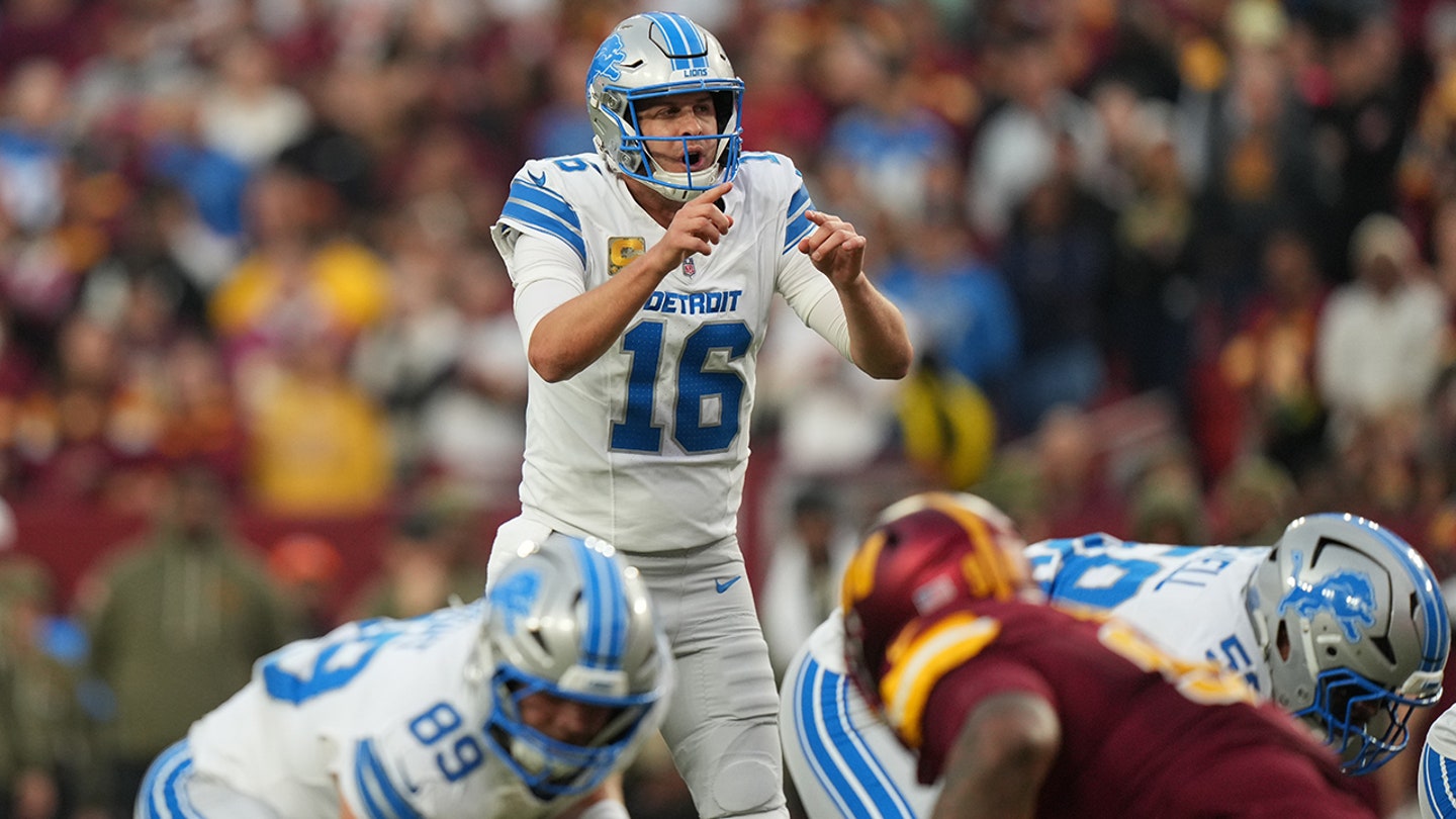 Rozohrávač Detroit Lions Jared Goff (16) si v nedeľu 9. novembra 2025 v Landoveri v štáte Maryland zahral na čiare počas prvého polčasu futbalového zápasu NFL proti Washington Commanders. (AP Photo/Stephanie Scarbrough)