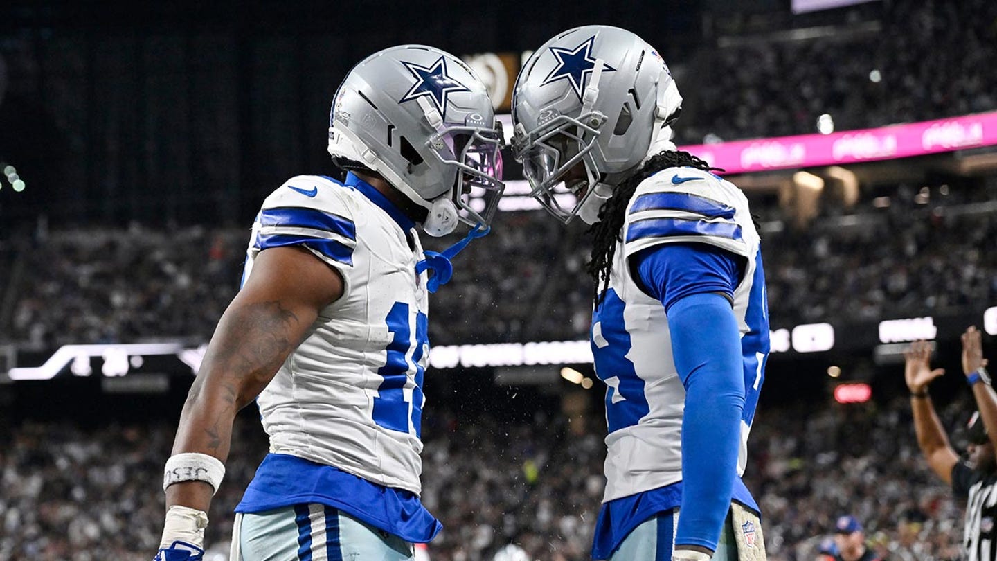 George Pickens a CeeDee Lamb z Dallas Cowboys oslavujú touchdown počas druhej štvrtiny proti Las Vegas Raiders na Allegiant Stadium 17. novembra 2025 v Las Vegas, Nevada. (Ian Maule/Getty Images)