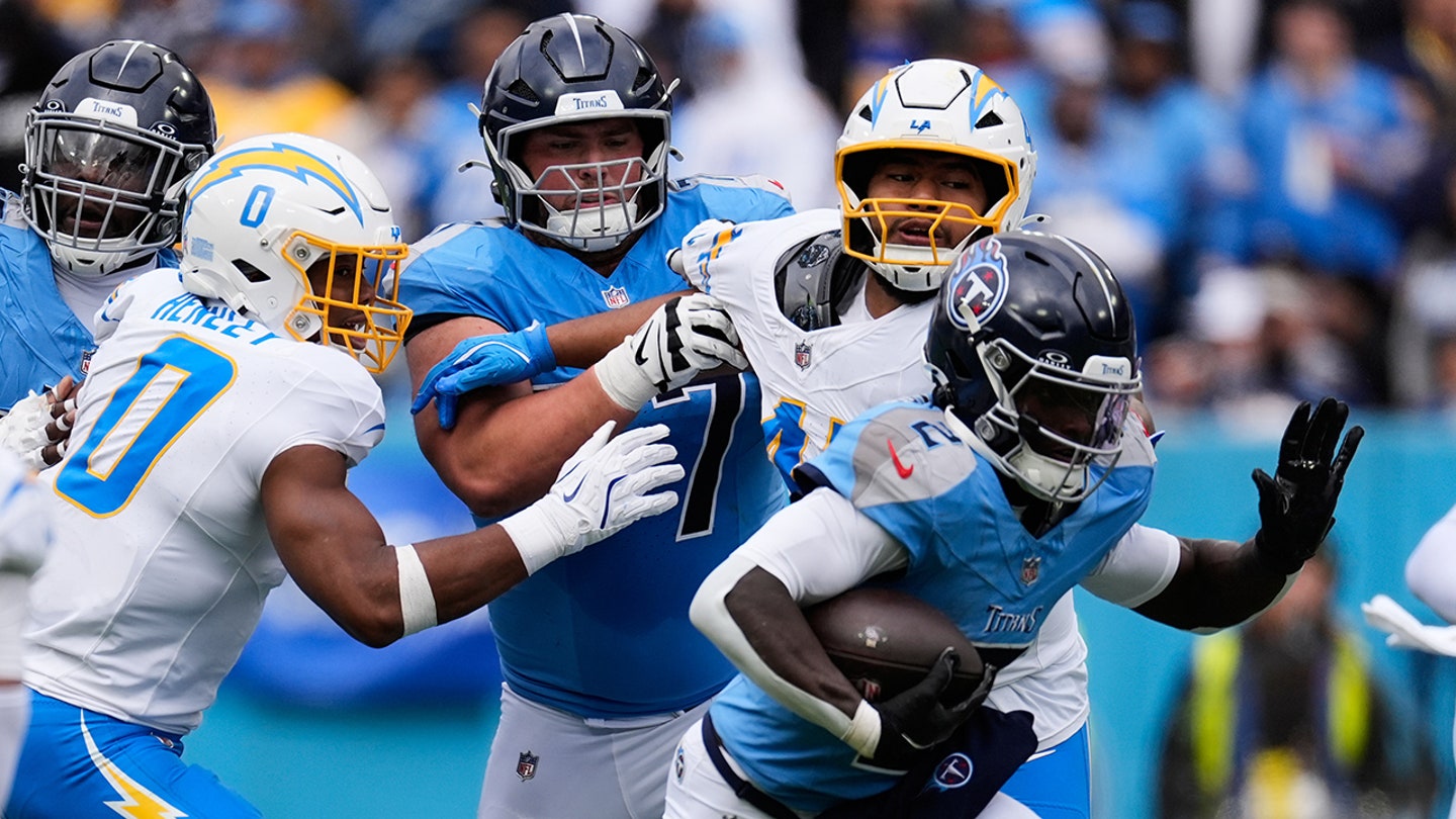 Tennessee Titans beží späť Tyjae Spears (2) prebehne okolo linebackera Los Angeles Chargers Daiyan Henley (0) počas druhého polčasu futbalového zápasu NFL v nedeľu 2. novembra 2025 v Nashville, Tennessee. (AP Photo/George Walker IV))