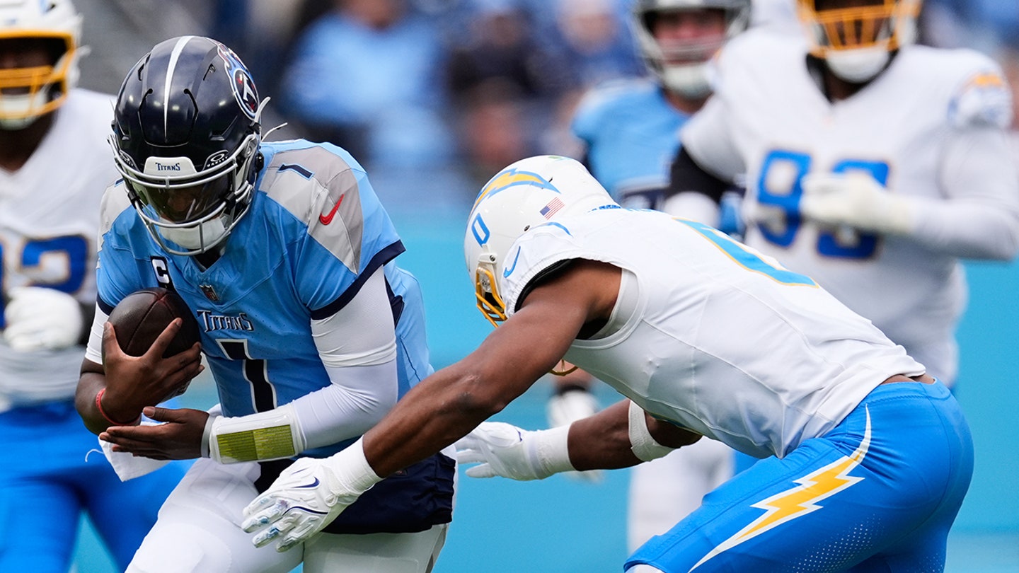 Obranca Tennessee Titans Cam Ward (1) je riešený linebackerom Los Angeles Chargers Daiyanom Henleym (0) počas prvého polčasu futbalového zápasu NFL v nedeľu 2. novembra 2025 v Nashville, Tennessee. (AP Photo/George Walker IV)