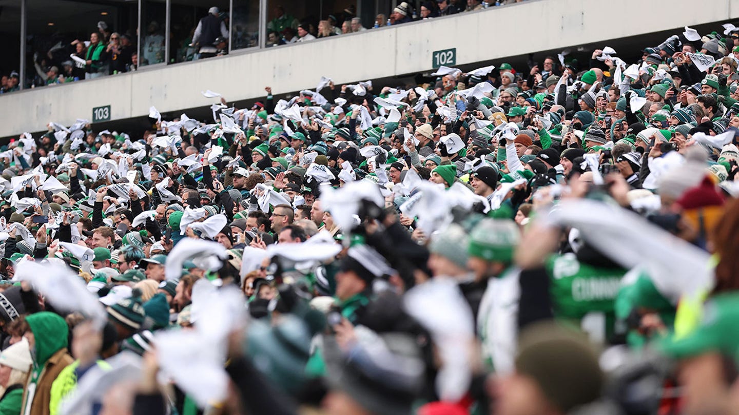 Fanúšikovia Philadelphia Eagles jasajú pred zápasom NFC Championship na Lincoln Financial Field 26. januára 2025. (Bill Streicher/Imagn Images)