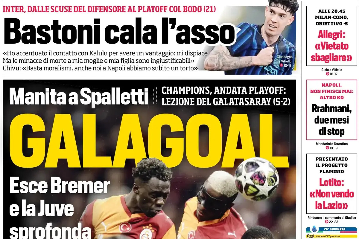 Bremer ko, Cabal vylúčený, Galatasaray vyhráva 5-2. Bude veľmi ťažké kvalifikovať sa do osemfinále v Turíne 25. Spalletti: „Krok späť“. Zastávka pre Comolliho a Chielliniho po chaose v tuneli San Siro