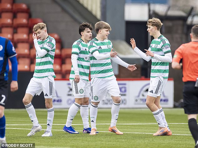 Mladí hráči Celticu zahajujú ďalší útok počas víťazstva 3:1 nad Cumbernauldom