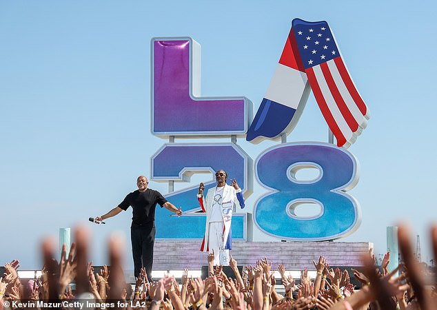 Dr. Dre a Snoop Dogg vystupujú na oslave odovzdania olympijských hier LA28