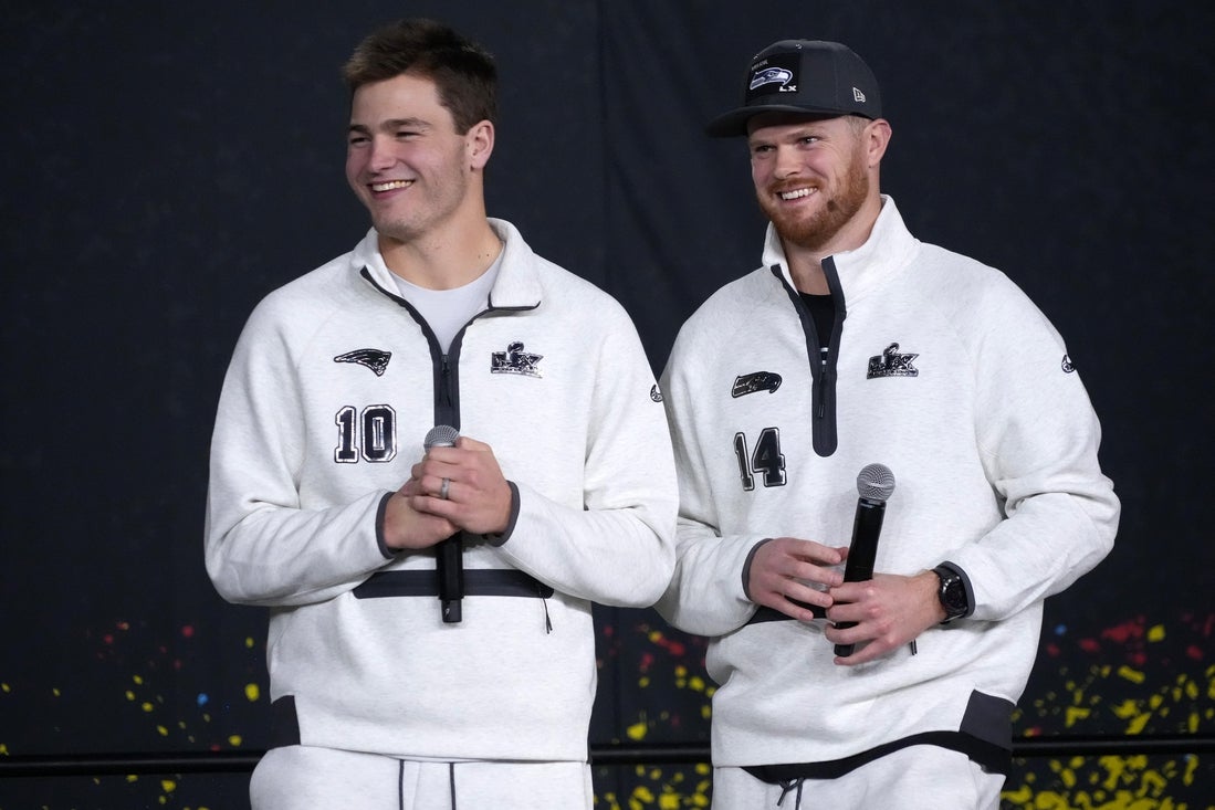 2. februára 2026; San Jose, CA, USA; Rozohrávač Seattle Seahawks Sam Darnold (14) a rozohrávač New England Patriots Drake Maye (10) počas otváracej noci Super Bowl LX v San Jose Convention Center. Povinný kredit: Kirby Lee-Imagn Images