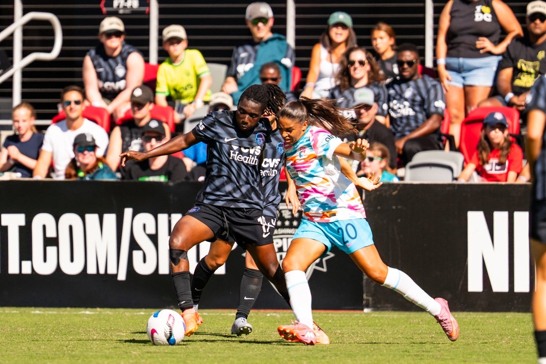 5. októbra 2025; Washington, oblasť Columbia, USA; Washington Spirit pred Rosemonde Kouassi (19) a San Diego Wave FC pred Delphine Cascarino (20) Bojujú za gule v 2. päťdesiat percent v oblasti Audi. Potrebný dlh: Emily Confidence Morgan-Imagn Images