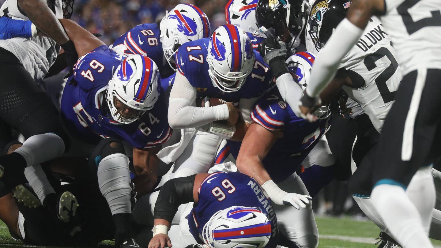 Rozohrávač Bills Josh Allen dostal 1 yard za prvý down v pretláčacej hre počas prvého polčasu na Highmark Stadium v Orchard Parku 23. septembra 2024.
