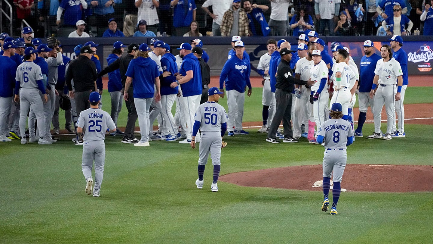 Nadhadzovač Los Angeles Dodgers Justin Wrobleski (70) je zadržaný Maxom Muncym z Los Angeles Dodgers po tom, čo zasiahol Andrésa Giméneza z tímu Toronto Blue Jays s nadhom, ktorý spôsobil uvoľnenie lavičiek počas štvrtej zmeny v zápase 7 bejzbalovej Svetovej série, v sobotu 1. novembra 2025 v Toronte. (AP Photo/Ashley Landis)