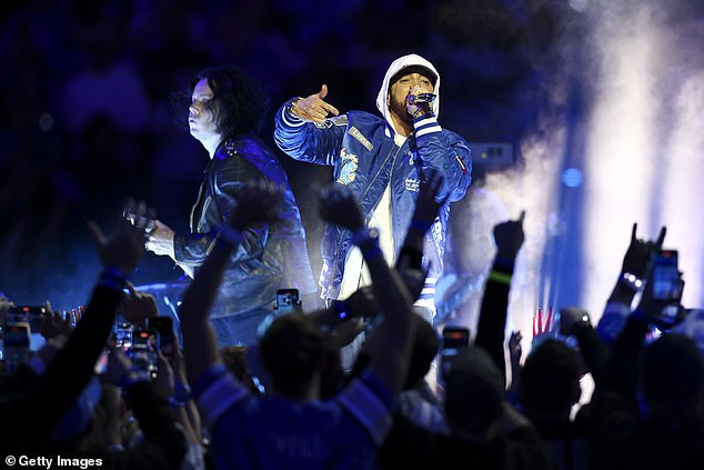Eminem a Jack White vystupujú počas polčasu zápasu na Deň vďakyvzdania v Detroite