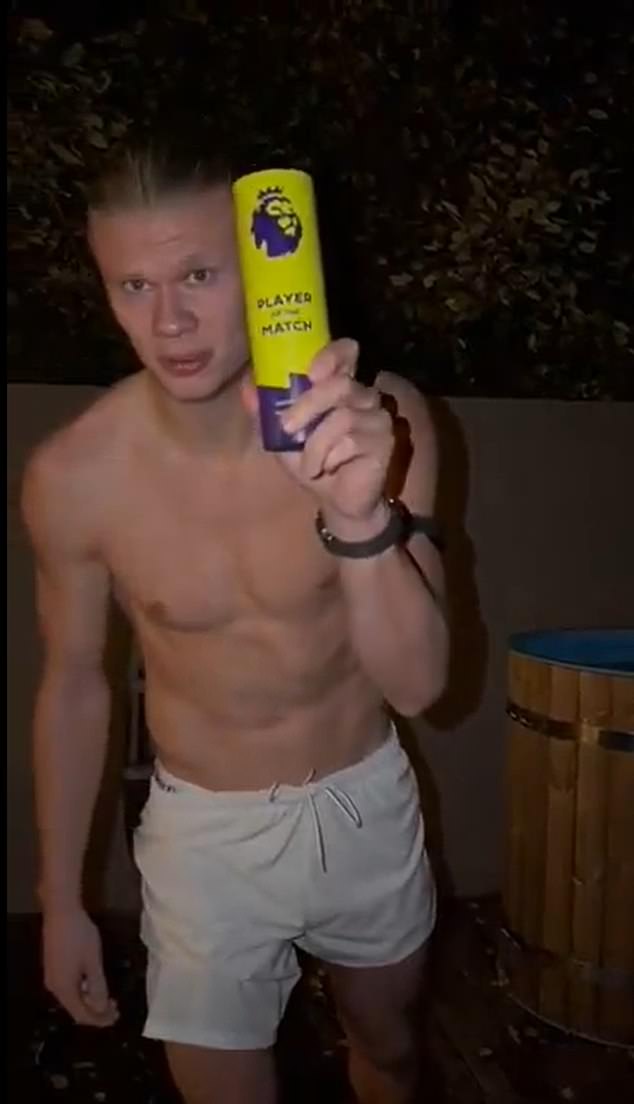 Haaland, ktorý stál pred niečím, čo vyzeralo ako jeho vlastný ľadový kúpeľ vo svojej záhrade, začal: „Len na motivačné účely,“ keď zdvihol cenu pre hráča zápasu.