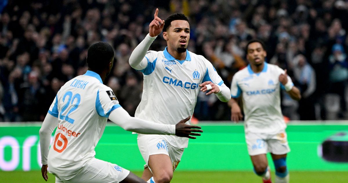 Anglický stredopoliar Marseille #11 Ethan Nwaneri (C) oslavuje po strelení gólu počas francúzskeho futbalového zápasu L1 medzi Olympique de Marseille (OM) a RC Lens na Stade Velodrome v Marseille v južnom Francúzsku 24. januára 2026.
