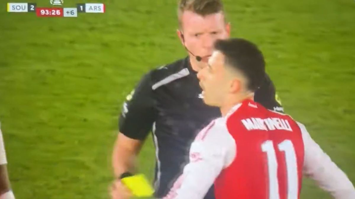 Útočník Arsenalu bol varovaný v záverečnej fáze prehry 2:1 v St Mary’s po tom, čo tlačil Sama Barrotta na ruku. K incidentu došlo v 94. minúte, keď Martinelli nadviazal kontakt s rozhodcom pri pokuse o rýchly priamy kop.