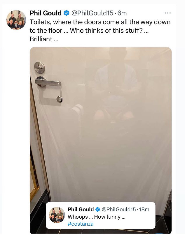 Phil Gould odstránil tweet, ktorý mu ukázal, že sa odrážal v toaletných dverách, keď sa prežíval, a pokrčil ho jednoduchým „hops“, pretože jeho nasledovníci mali deň v teréne
