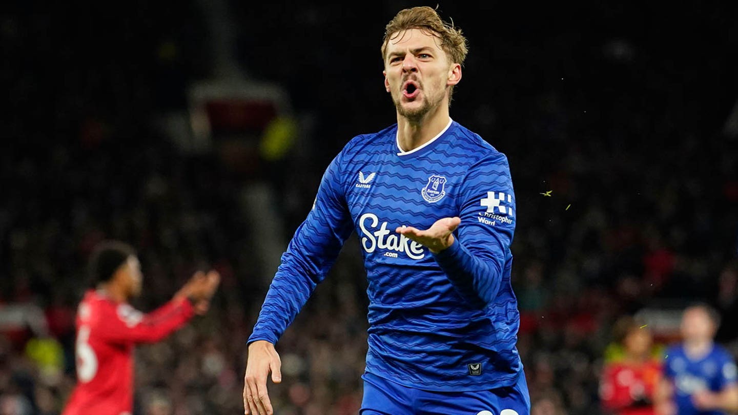 Kiernan Dewsbury-Hall z Evertonu oslavuje po strelení úvodného gólu počas zápasu anglickej futbalovej Premier League medzi Manchestrom United a Evertonom v anglickom Manchestri v pondelok 24. novembra 2025. (Dave Thompson/fotografia AP)