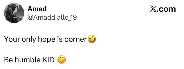Krídelník zverejnil príspevok na X v reakcii na fanúšika Manchestru United: „Tvojou jedinou nádejou je roh,“ sprevádzaný vysmiatymi emotikonmi.