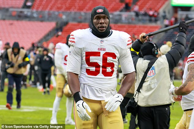 Obranný líder San Francisco 49ers Keion White sa zotavuje po strele do členka počas stretnutia po Super Bowle v San Franciscu v pondelok ráno.