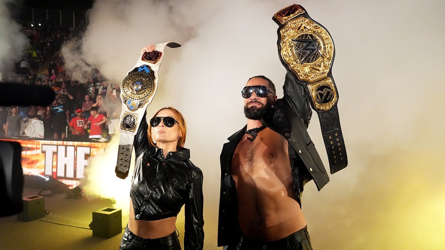 Becky Lynch a Seth Rollins sa dostanú do ringu počas „Monday Night RAW“ v Mass Mutual Center 15. septembra 2025 v Springfielde, Massachusetts. (Rich Freeda/WWE cez Getty Images))