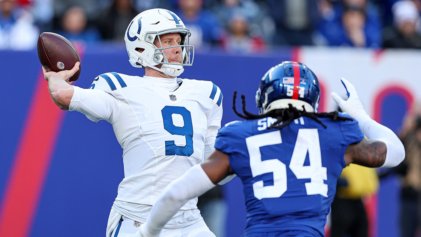 Indianapolis Colts quarterback Nick Foles (9) hodí sféru ako linebacker Giants New York City Giants Jaylon Smith (54) v priebehu prvých päťdesiat percent v MetLife Arena vo East Rutherford, New Jacket, 1. januára 2023. (Vincent Pascetta/USA Today Sports)