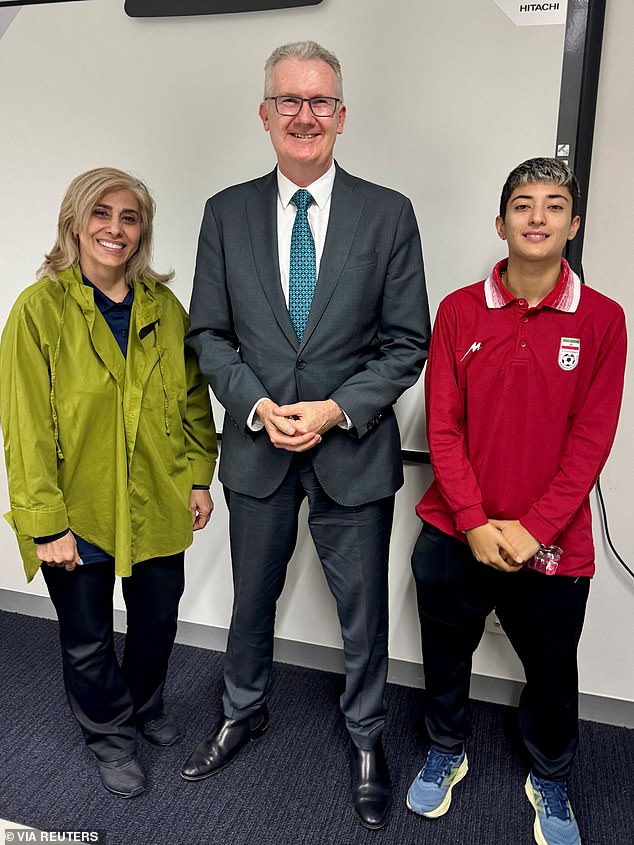 Austrálsky minister vnútra Tony Burke pózuje s podpornou pracovníčkou iránskeho ženského futbalového tímu Zahrou Soltan Meshkeh Kar a tímovou hráčkou Mohaddeseh Zolfiovou, ktoré v utorok dostali azyl. Odvtedy jedna z dvoch žien podľa Burkeovej zmenila názor