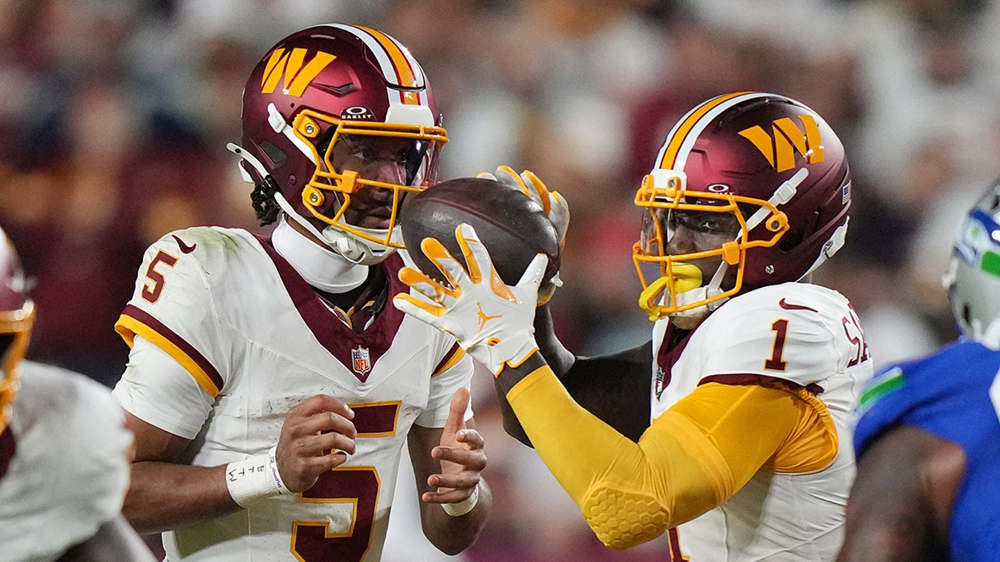 Wide receiver Washington Commanders Deebo Samuel (1) hádže loptou quarterback Washington Commanders Jayden Daniels (5) počas prvého polčasu futbalového zápasu NFL proti Seattle Seahawks, v nedeľu 2. novembra 2025 v Landover, Maryland. (AP Photo/Stephanie Scarbrough)