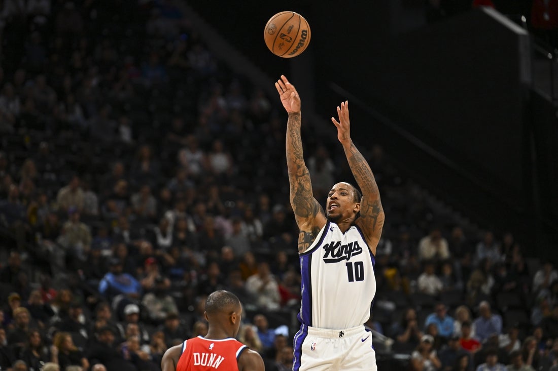 14. marca 2026; Inglewood, Kalifornia, USA; Útočník Sacramenta Kings DeMar DeRozan (10) strieľa proti strážcovi LA Clippers Krisovi Dunnovi (8) počas druhého polčasu v Intuit Dome. Povinný kredit: Jonathan Hui-Imagn Images